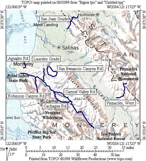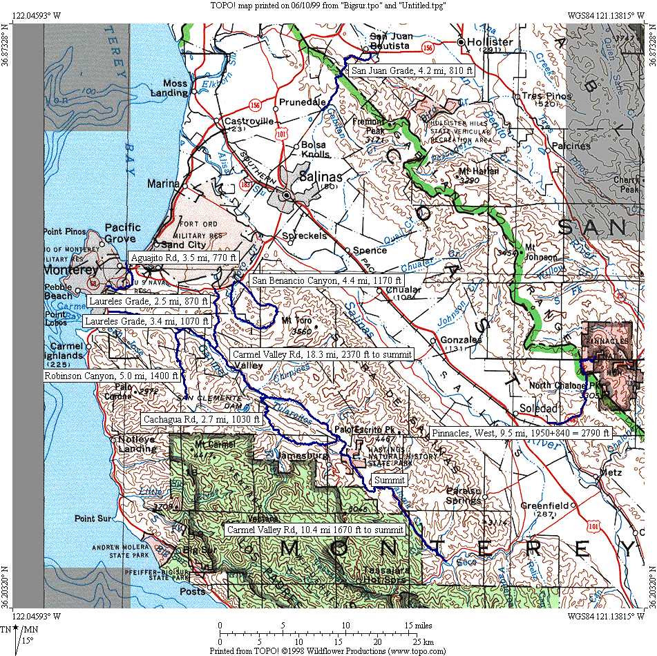 Aguajito Rd - 3.5 miles, 770 feetAguajito Rd climbs over the hill just east of Highway 1 near Monterey. Food/water can be found on Del Monte Ave. Distance Elevation Details 0.0 10 Del Monte Blvd 0.7 20 cross over Highway 1 2.0 200 change of grade 3.0 520 Viejo Rd 3.5 780 summit 4.4 590 Highway 1 & Highway 68 Cachagua Rd - 14 miles, 1030 feetBoth ends of this road connect up with Carmel Valley Rd, making it possible to do a loop, starting from Carmel Valley Village. There is a nice little store along this road. Distance Elevation Details 0.0 630 Carmel Valley Rd 2.0 1600 change of grade 2.7 1660 summit 4.8 820 change of grade 6.2 850 country store 11.7 1590 Carmel Valley Rd Carmel Valley Rd - 18.3 miles, 2370 feet (from Carmel Valley Village to summit)Carmel Valley Village has places to get food/water. At the far end, there is a store on Arroyo Seco Rd about a quarter mile downhill from the junction. There is also a store midway on Cachagua Rd if you decide to take this scenic detour. There is more traffic the closer you get to the Highway 1 end, and very little traffic on the far end. Distance Elevation Details 0.0 80 Highway 1 6.1 150 Robinson Canyon Rd 9.4 230 Laureles Grade 11.5 400 Carmel Valley Village 16.0 630 Cachagua Rd 22.9 1660 change of grade 23.3 1590 Cachagua Rd 24.6 1700 change of grade 25.4 1490 change of grade 29.8 2390 summit 40.2 700 Arroyo Seco Rd Laureles Grade - 3.4 miles, 1070 feetLaureles Grade is a Billygoat in either direction. Being a through road, it can be combined with others to make a nice loop. Carmel Valley Village is 2 miles from the south end, and there are other places near the north end also. Distance Elevation Details 0.0 430 Monterey-Salinas Hwy (Highway 68) 2.5 1300 summit 3.8 1100 change of grade 5.9 230 Carmel Valley Rd Robinson Canyon Rd - 5.0 miles, 1400 feetThere is a Safeway shopping center adjacent to the junction with Carmel Valley Rd. This is an out and back road, with the top of the Billy Goat at 5.0 miles. Extra credit when you continue on to the end. Distance Elevation Details 0.0 150 Carmel Valley Rd 3.1 710 change of grade 5.0 1550 summit 5.9 1350 reservoir 7.1 1475 junction with ... San Benancio Canyon Rd - 4.4 miles, 1170 feetThis road can be combined with Corral de Tierra Rd to form a loop, beginning and ending on Monterey-Salinas Hwy. Food/water can be found by going east on Monterey-Salinas Hwy. Distance Elevation Details 0.0 250 Monterey-Salinas Hwy (Highway 68) 3.0 800 change of grade 4.4 1420 summit 4.5 1390 the gap - changes to Corral de Tierra Rd 5.8 960 change of grade 6.1 1000 change of grade 10.3 410 junction - turn to stay on Corral de Tierra Rd 10.3 410 straight to take Robley Rd to Laureles Grade 11.0 370 change of grade 11.2 410 change of grade 12.4 290 Monterey-Salinas (Highway 68) San Juan Grade - 4.2 miles, 810 feetFood/water can be found in San Juan Bautista, on the north end of this road. There are no services close to the south end. Crazy Horse Canyon Rd connects to Old Stage Rd for routes going south, but effectively dead-ends on busy Hwy 101 for anyone trying to go northwest. Distance Elevation Details 0.0 210 Highway 156 in San Juan Bautista 0.3 240 Fremont Peak Rd 2.0 420 change of grade 4.2 1020 summit 4.7 920 change of grade 5.0 950 change of grade 7.5 300 change of grade 9.0 270 Crazy Horse Canyon Rd | ||